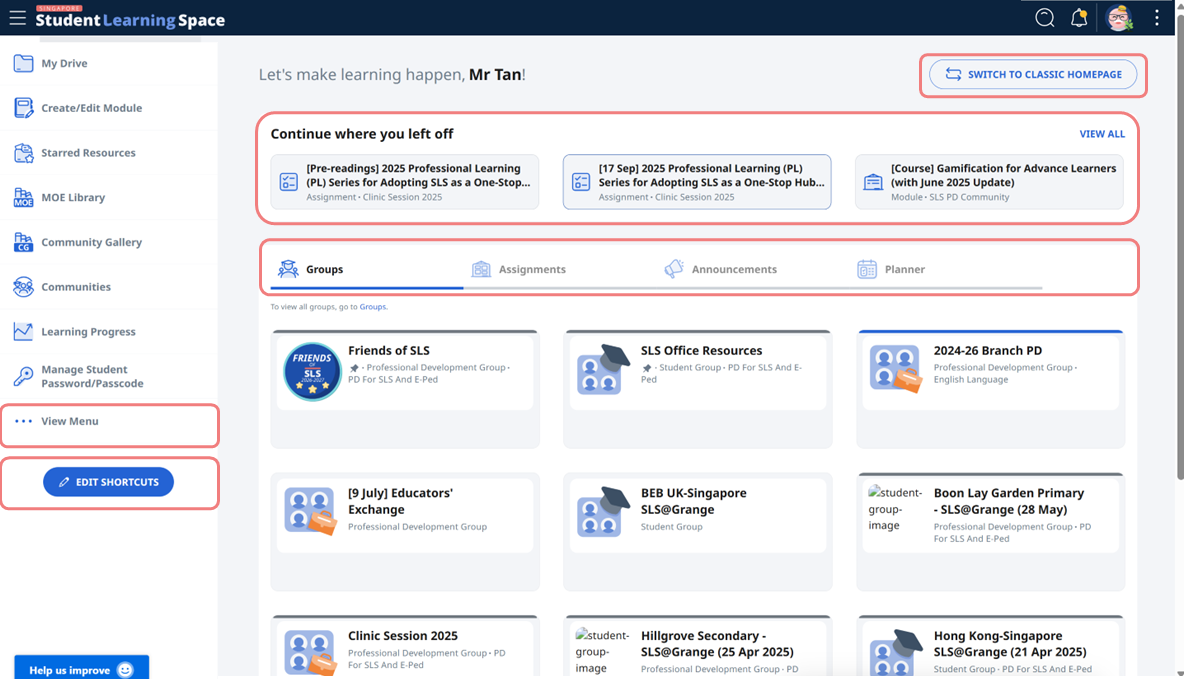 Open the left menu and click Edit Shortcuts to customise your SLS homepage based on your teaching and learning needs.