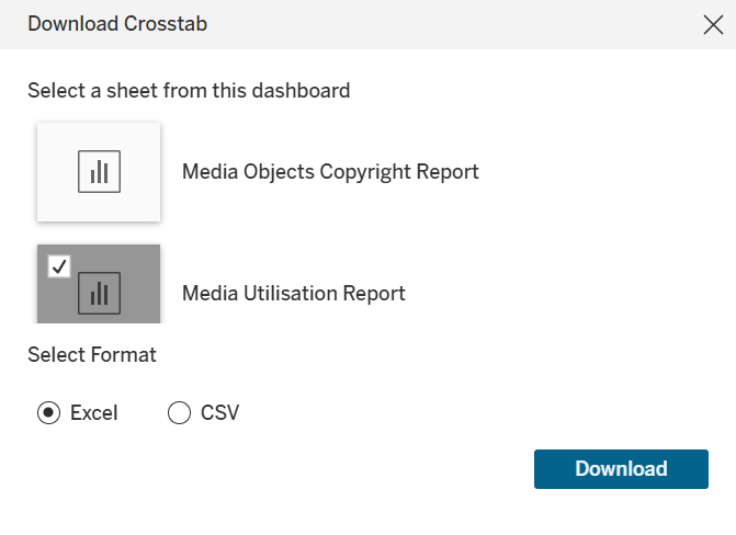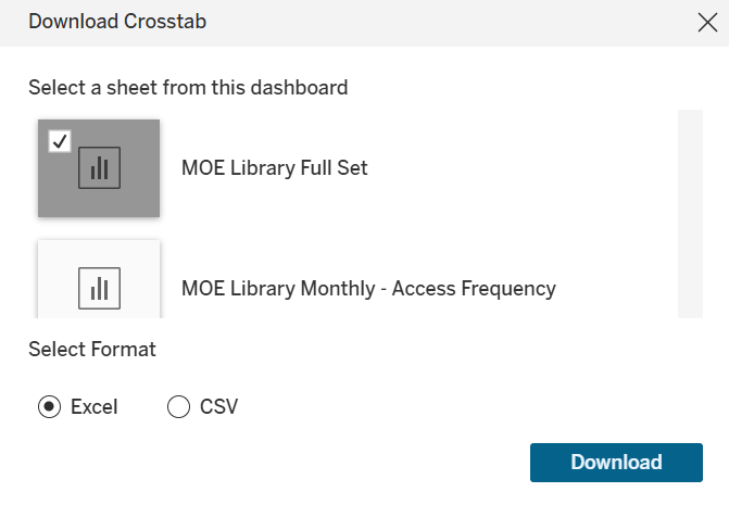 Click the download icon at the bottom and select Crosstab icon. In the pop-up that appears, check that “MOE Library Full Set” (for the module utilisation report) or “Media Utilisation Report” is selected, then click Download.