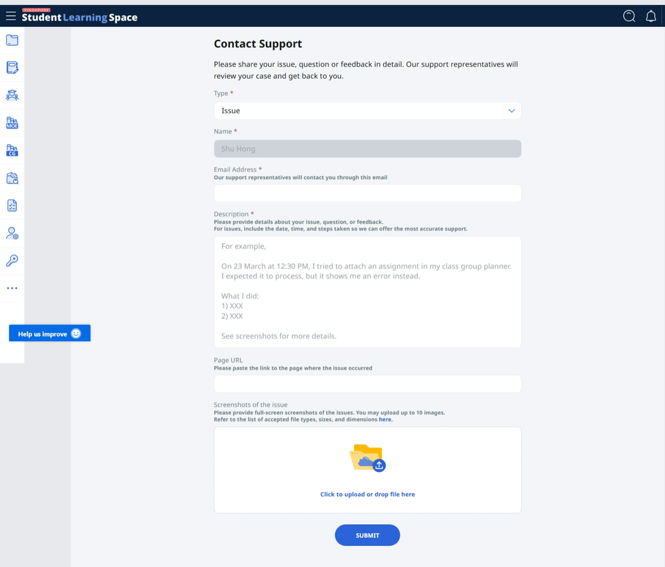 You can submit Helpdesk tickets with pre-filled details and attach multiple images for clearer support requests.