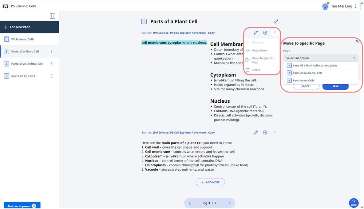 When moving the notes to a specific page, select the page from the dropdown list and click Save to confirm.