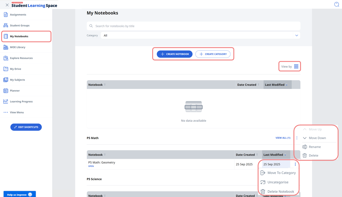 Click Create Category to organise your notebooks. For each category, click the overflow (3-dot) icon to move, rename, or delete it.