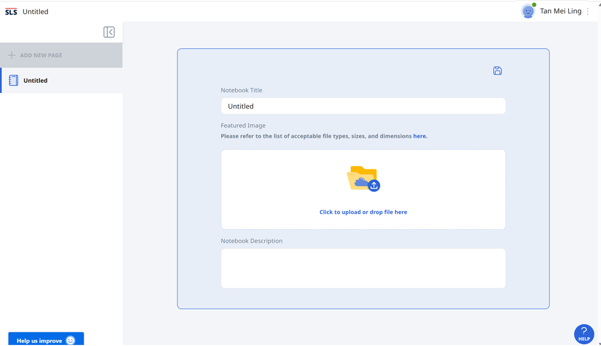 After creating a new notebook, enter the title, upload an image as cover, and add a description. Click anywhere outside the component to auto-save. To make changes later, click the pencil icon.