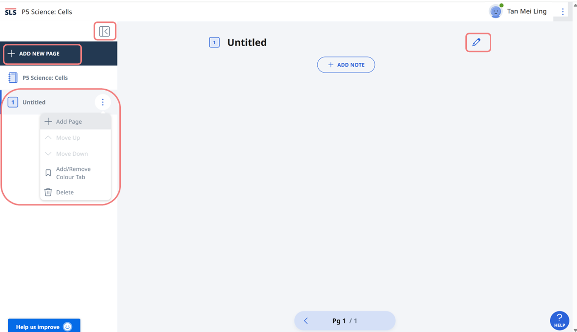Click the pencil icon to edit the page title, or use the overflow (3-dot) icon to add/move a page, add/remove colour tab, or delete the page.