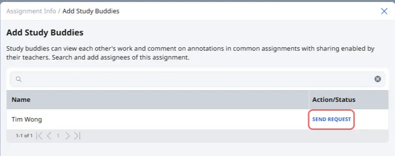 Use the search bar to search for a study buddy. Click Send Request to select the study buddy that you want to share your assignment with.
