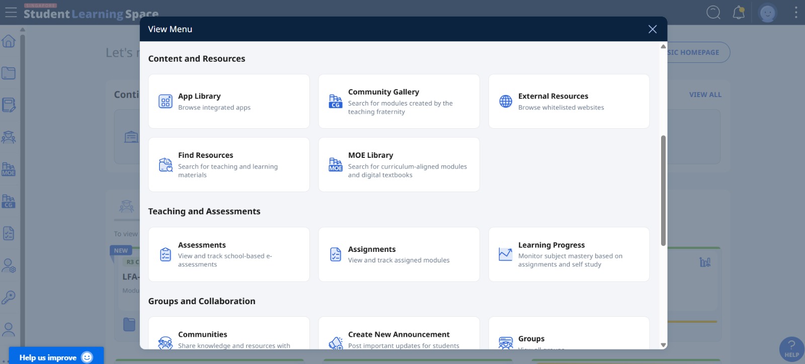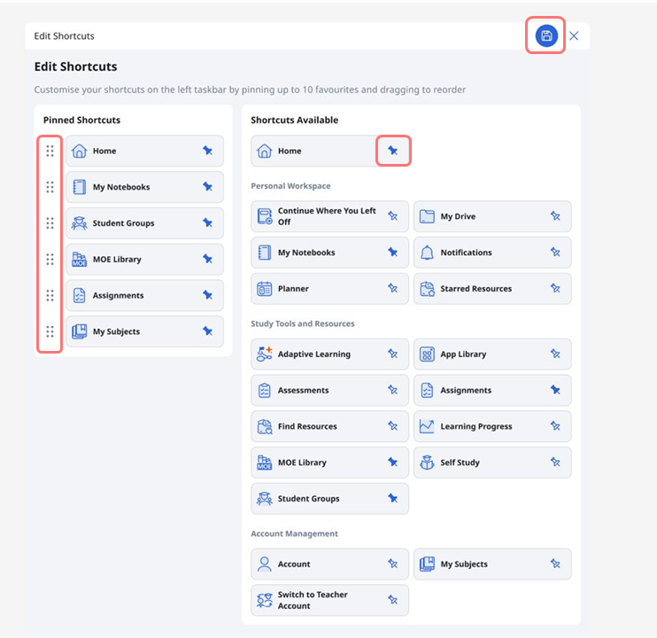 Students can personalise their SLS dashboard according to their learning needs by pinning, unpinning, and rearranging frequently used shortcuts, allowing quick and easy access.