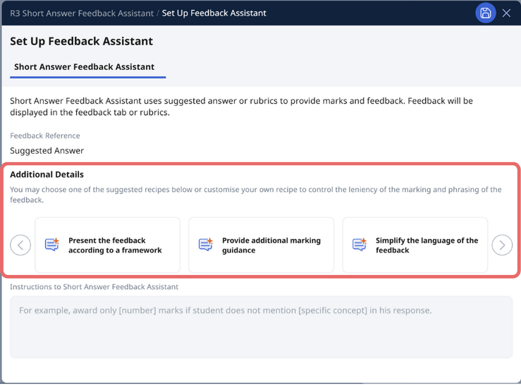 Under Additional Details, you may choose one of the suggested recipes below or create your own to adjust the marking leniency and style of the feedback.