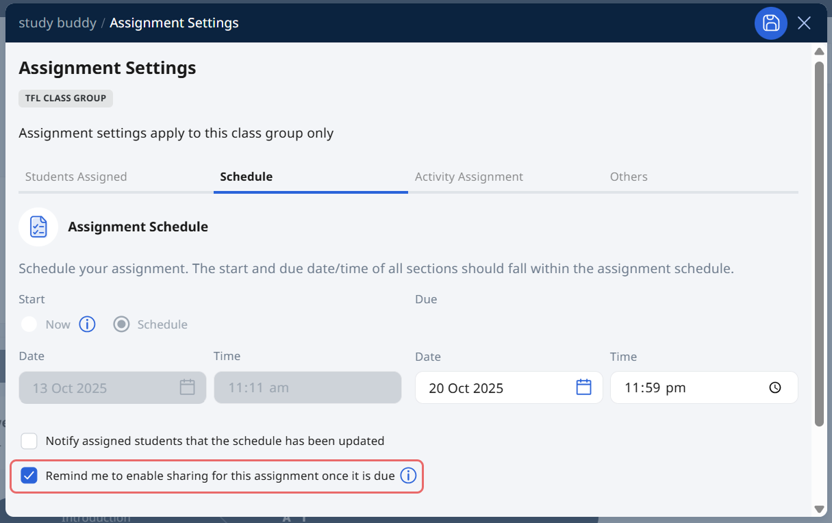 To configure this setting, select the Schedule tab and uncheck the box Remind me to enable sharing for this assignment once it is due.