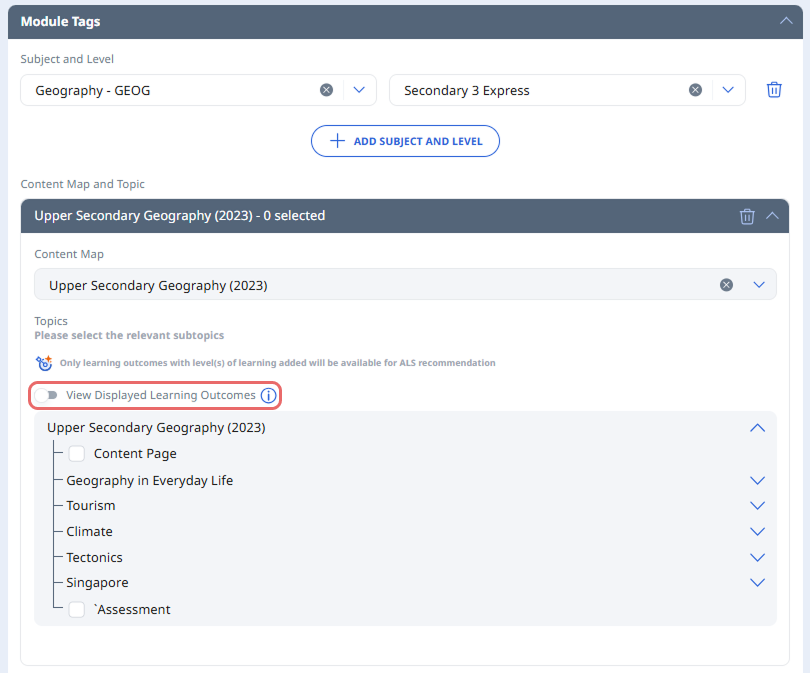 Note: From Dec 2025 Update, teachers can toggle between viewing displayed learning outcomes or learning outcomes. Displayed learning outcomes are learning outcomes with more student-friendly language that are shown to students when added by Content Approvers and Content Officers (CAs and COs). This only applies to Content Maps with pre-populated Displayed Learning Outcomes.