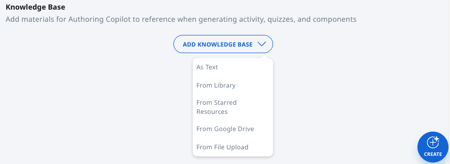 You can add a Knowledge Base by clicking Add Knowledge Base. You can upload up to 20 Knowledge Bases that can comprise text (up to 100,000 characters) and files. These Knowledge Bases can be used when generating sections, activities/quizzes and components in a module.