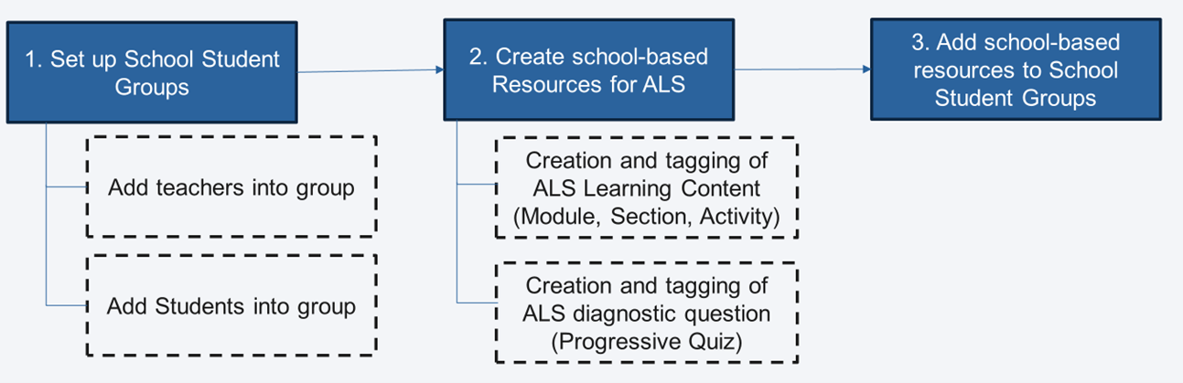 ALS has been enhanced to allow teachers to better customise ALS according to the needs of their students. Teachers can tag their own content and assessment items to ALS content maps and allow these to be recommended by ALS for their students, in addition to existing content items developed by CPDD.